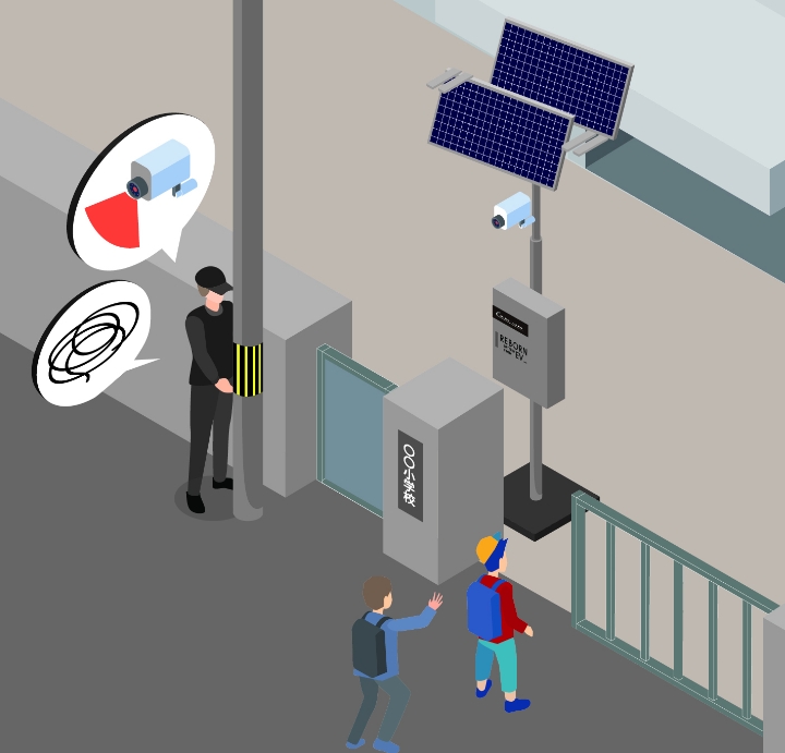 防犯カメラとしてTHE REBORN LIGHT smartは、カメラと組み合わせるができます。 公園や通学路など、人目が届きにくい場所にも電源不要で設置できるため、地域の安全を守ることが出来ます。